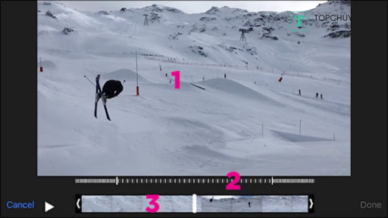 Sau đó, một giao diện chỉnh sửa sẽ hiển thị. Bạn có thể xem hình chụp màn hình của giao diện chỉnh sửa để hiểu rõ hơn về các thành phần của nó. Trên hình, số 1 là khung xem trước video (Video Preview), số 2 là thanh thời gian chuyển động chậm (Slow Motion Timeline) và số 3 là thanh thời gian video (Video Timeline). Ngoài ra, hai bên cạnh có các nút Hủy (Cancel), Phát (Play) và Hoàn tất (Done).