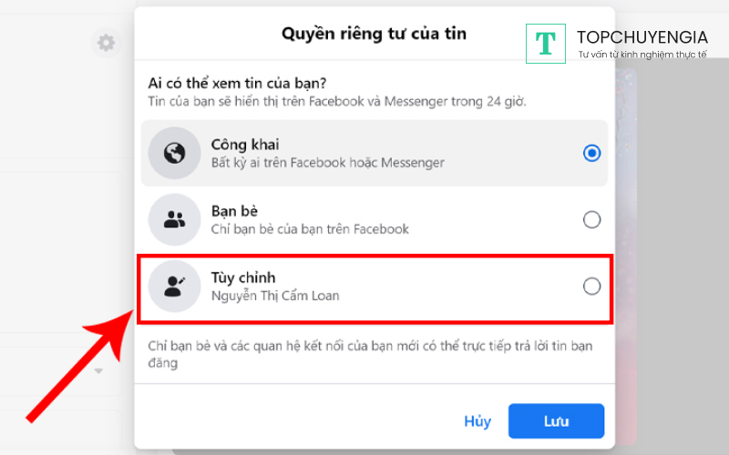 Bước 1: Vào phần cài đặt quyền riêng tư của tin tùy chỉnh ai có thể nhìn thấy tin của bạn ở trong Messenger hoặc Facebook. Người dùng có thể tùy chỉnh trước khi đăng một story bất kì.