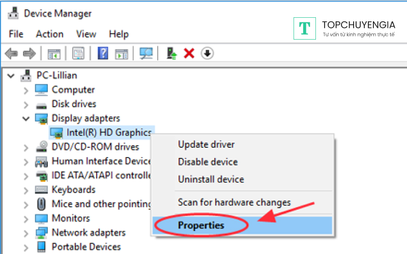 Bước 3: Để xem thông tin chi tiết, bạn nhấn chuột phải vào tên card màn hình rồi chọn tiếp vào Properties.