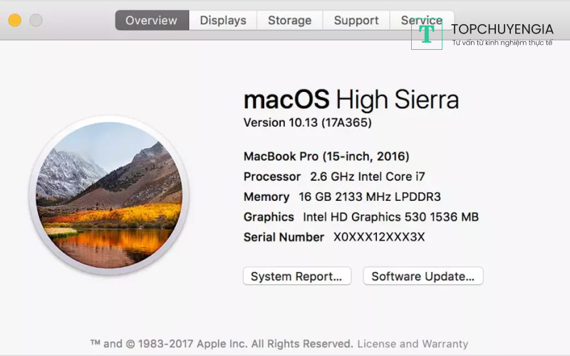 Cửa sổ About This Mac sẽ hiện ra, ở đây sẽ cung cấp cho người dùng tổng quan của chiếc laptop, bao gồm các tab Overview, Displays, Storage, Support và Service.