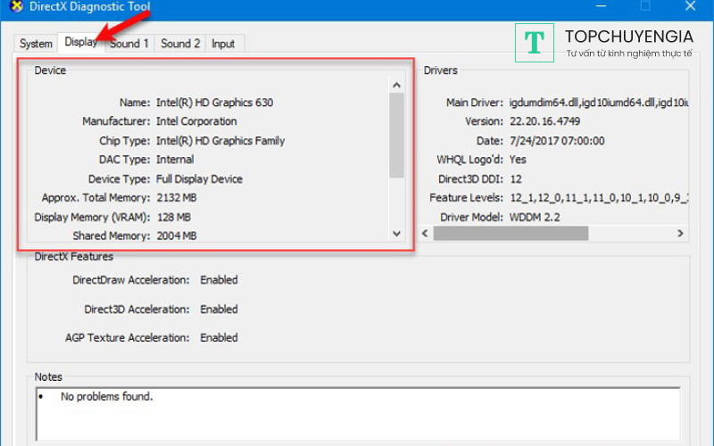 Bước 2: Cửa sổ DirectX Diagnostic Tool sẽ hiện lên, bạn chọn vào tab Display, trong phần Device là thông tin về card màn hình đang chạy trên máy của bạn.