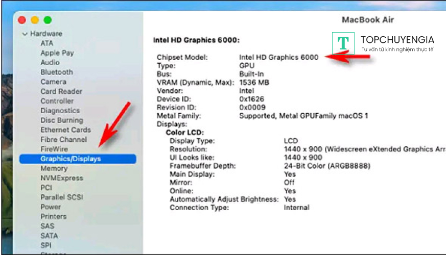 Cửa sổ System Information sẽ hiện ra, trong phần Hardware, bạn nhấn chọn vào mục Graphics/Displays. Những thông tin rất đầy đủ và chi tiết về GPU đang chạy trên thiết bị được hiển thị ở trong mục này như phiên bản chipset, bộ nhớ VRAM… Ngoài ra, ở đây cũng có những thông tin về thông số của màn hình hiển thị như công nghệ màn hình, độ phân giải, bit màu… Dù thiết bị của bạn sử dụng chip Apple hay Intel, thì phần thông tin cấu hình card đồ họa đều được cung cấp chi tiết và chính xác ở đây.
