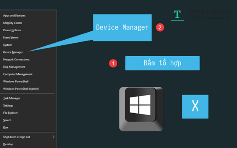 Bước 1: Bạn nhấn tổ hợp phím Windows + X, dòng tùy chọn hiện lên, bạn nhấn chọn Device Manager.