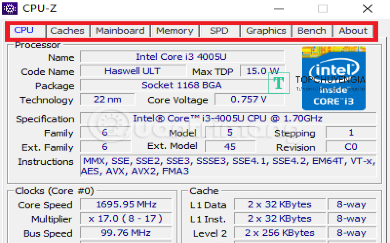 Tab CPU: Tên chip xử lý máy tính bạn đang sử dụng, xung nhịp, số nhân số luồng…
