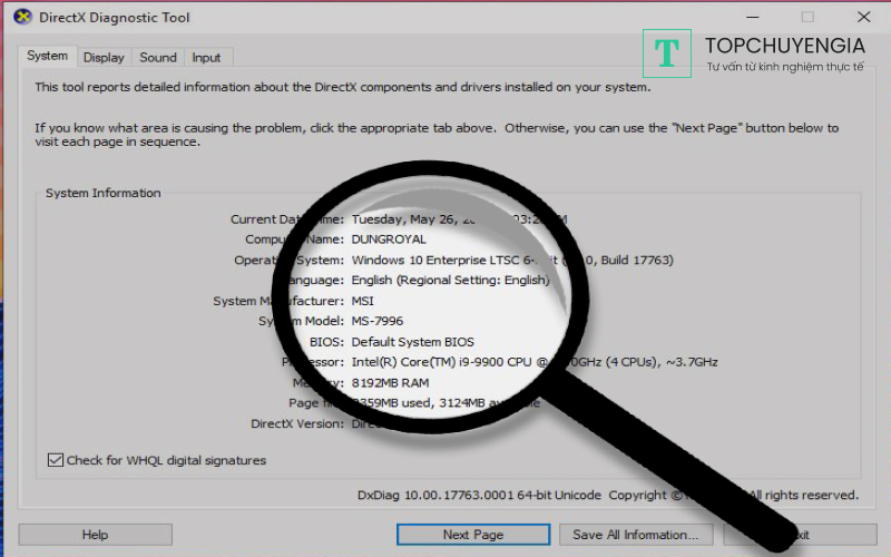 • Sử dụng lệnh dxdiag để xem phần cứng máy tính