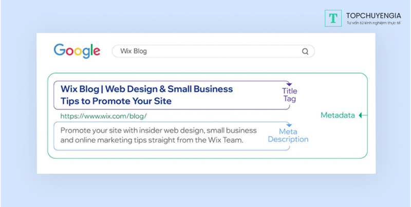 Khi bạn nhập một truy vấn lên Google, bạn sẽ thấy các thẻ meta được hiển thị ở một định dạng cụ thể: chữ màu xanh lam (được gọi là thẻ tiêu đề hoặc tiêu đề SEO) và dòng chữ đen ngắn bên dưới nó (được gọi là mô tả meta). Cùng với nhau, thông tin này được gọi là siêu dữ liệu.