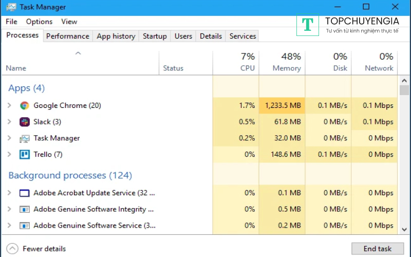 • Tắt các ứng dụng chạy ngầm bằng cách mở Task Manager. Nhấn tổ hợp phím Ctrl + Shift + Esc để mở Task Manager lên, trong cửa sổ Task Manager, ở tab đầu tiên trong phần Background Process, tìm những ứng dụng ngầm và nhấn phím Delete để tắt đi chúng đi.