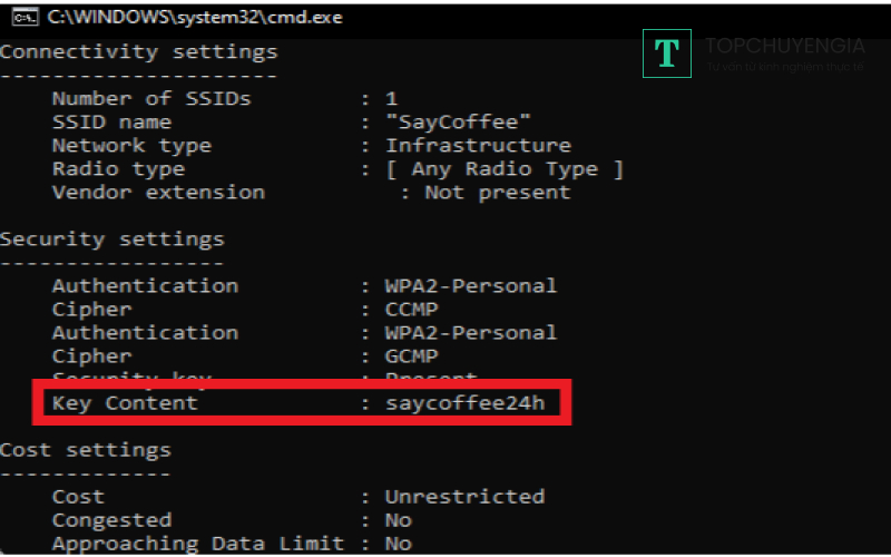Cửa sổ Command Prompt sẽ hiển thị thông tin về wifi đó. Mật khẩu chính xác của nó sẽ nằm ở mục Key Content. Cách này rất nhanh chóng và dễ dàng phải không nào.
