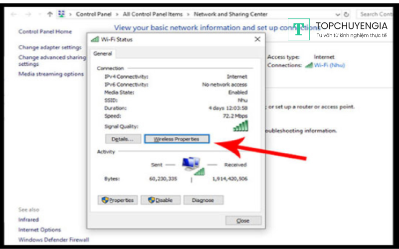 Bước 5: Trong cửa sổ Wireless Status, bạn nhấn vào Wireless Properties.