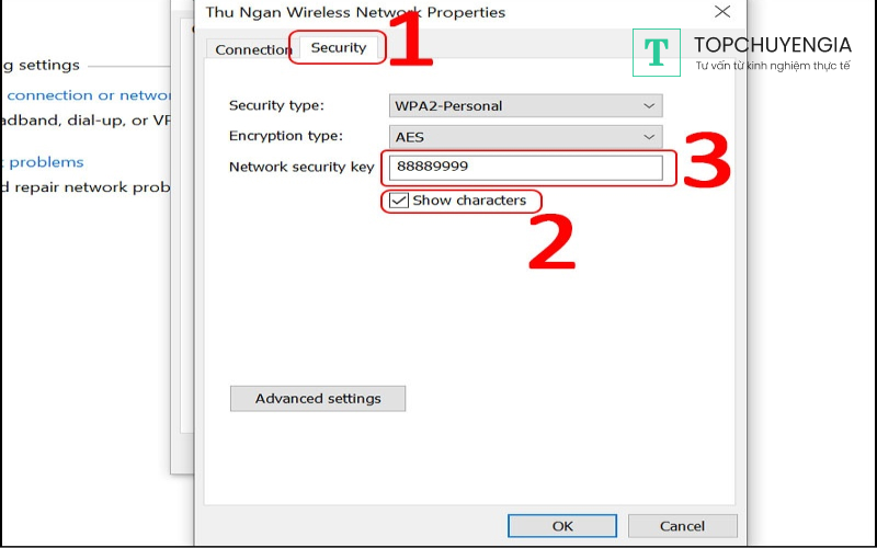 Bước 7: Trong tab Security, phần Network security key chính là mật khẩu wifi đang kết nối trên máy tính của bạn. Cuối cùng chỉ cần tích chọn vào Show characters để xem pass wifi bị ẩn đi nhé.
