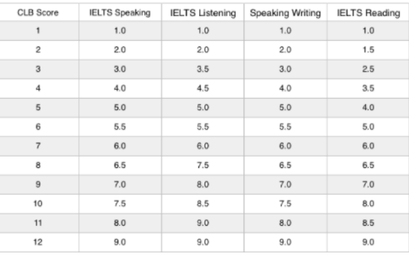 Yêu cầu IELTS tối thiểu cho Thị thực du học Canada được giám sát bởi hệ thống Điểm chuẩn ngôn ngữ Canada (CLB),  đây là tiêu chuẩn quốc gia được sử dụng ở Canada để xác định, công nhận trình độ tiếng Anh. Hệ thống tính điểm từ 1 đến 12, với mỗi điểm của hệ thống bằng với điểm IELTS cụ thể trong phần Nói, Nghe, Viết và Đọc.