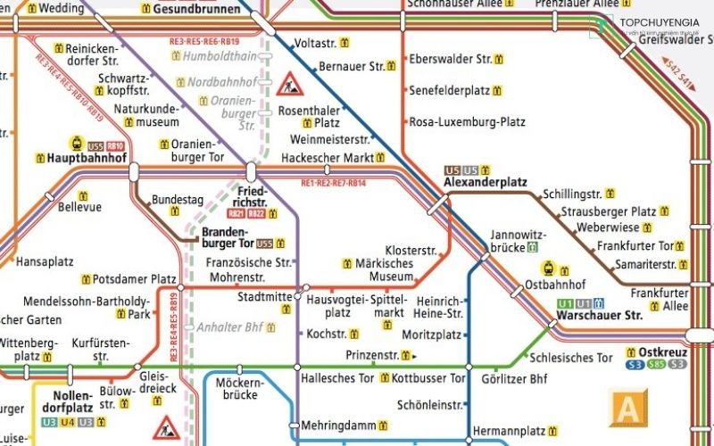 Bản đồ line tàu tại Berlin: các tuyến S- và U-Bahn, cũng như các tuyến xe lửa Regio
