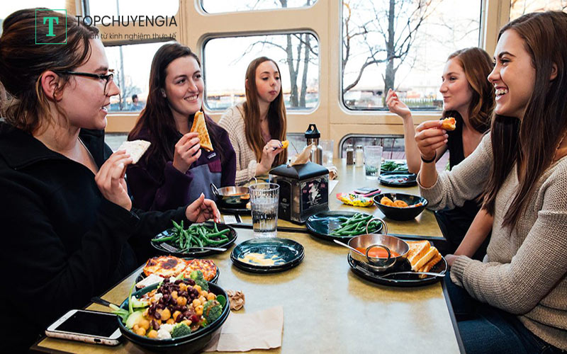 Đối với một người, tiền tạp hóa lên tới 400 - 600 USD mỗi tháng. Điều này phụ thuộc vào thói quen ăn uống của bạn và nếu một số bữa ăn được bao gồm trong chỗ ở của bạn tại trường đại học. Hãy mua đồ tại các siêu thị giá rẻ như: Walmart, Target, Costco, Trader Joe's. Nếu bạn sống trong ký túc xá, bạn có thể chọn các gói bữa ăn trong khuôn viên trường, mà bạn sẽ phải trả khoảng 250 USD/tháng.